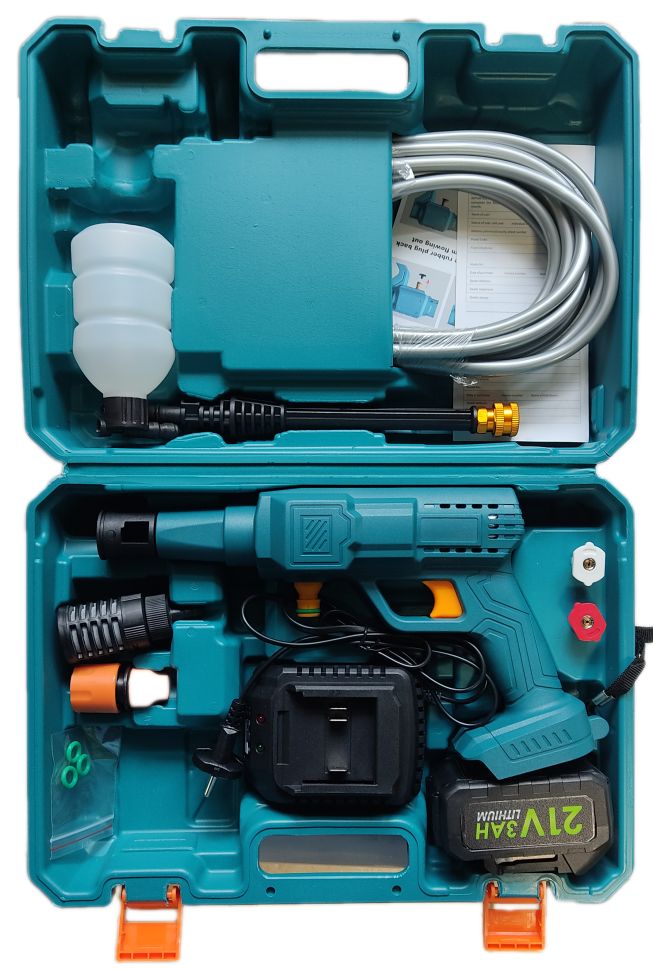 Водоструйка ( воден пистолет) с батерия за почистване на климатици. Комплекта включва маркуч, накрайници за плоска и кръгла струя, филтър.